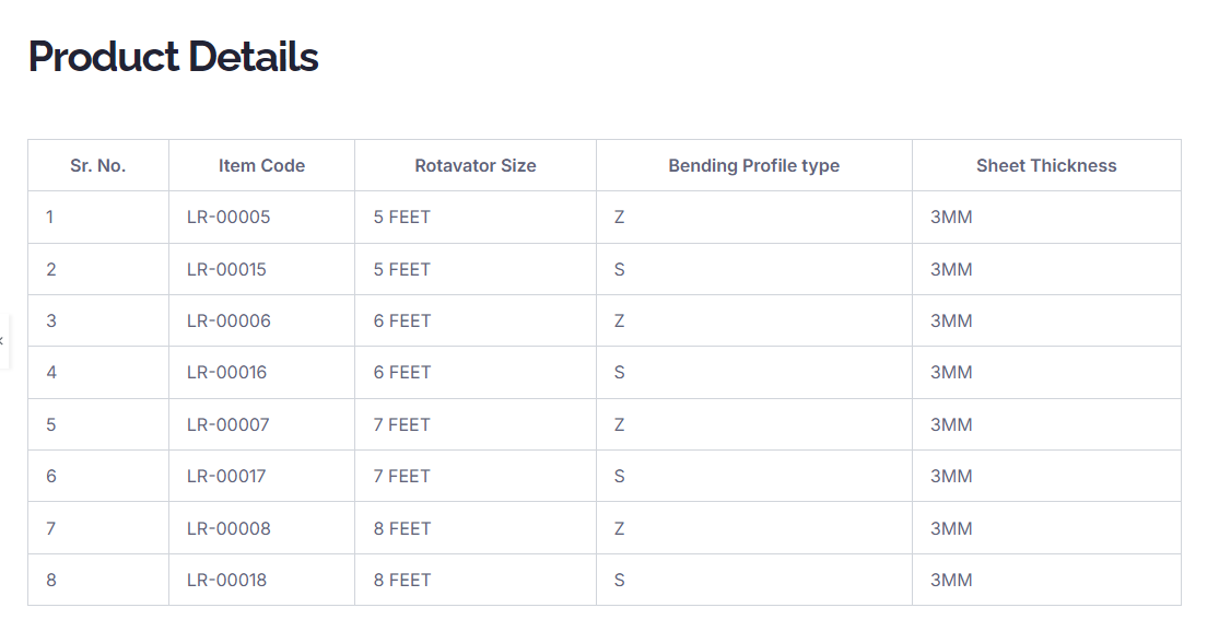 Sr. No.Item CodeRotavator SizeBending Profile typeSheet Thickness